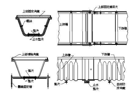 B.將下游之U型溝另端套入止水墊片壓實後,將上游之另端裝疊,再將螺絲鎖緊固定。