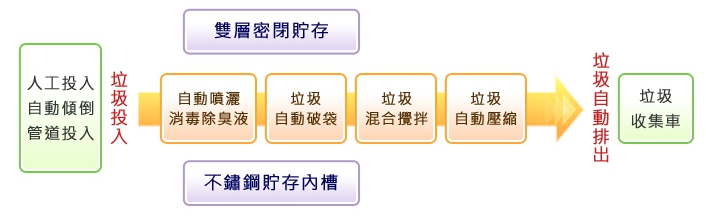 垃圾壓縮貯存設備,是綠建築標章社區必備設施,垃圾壓縮減容,自動傾倒,清運最方便。