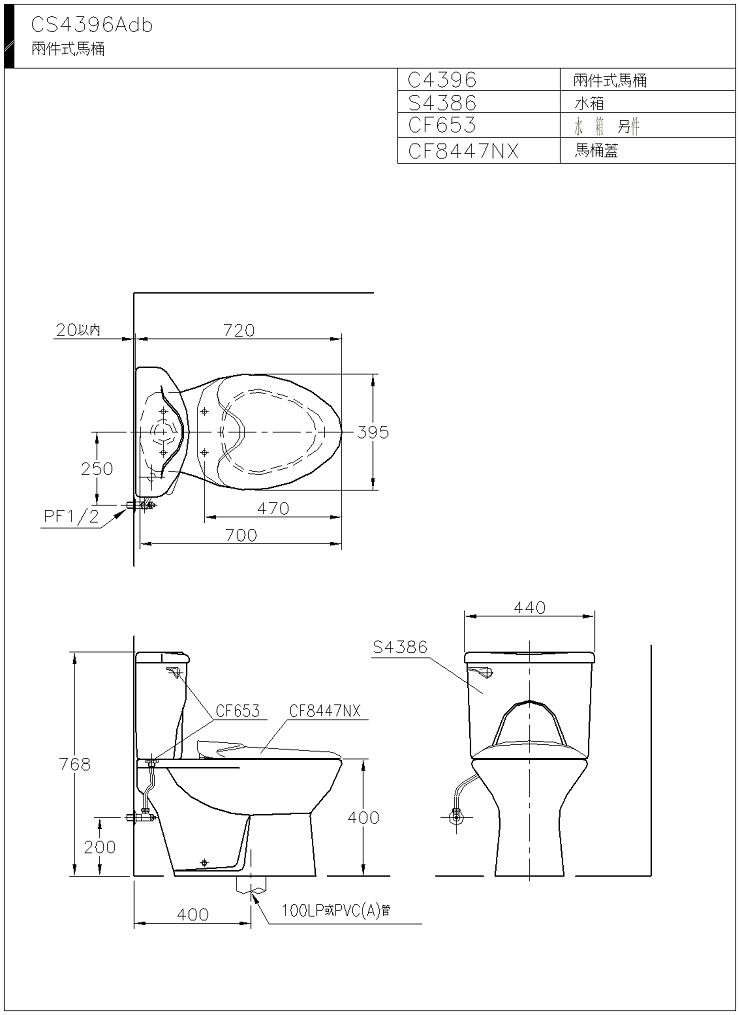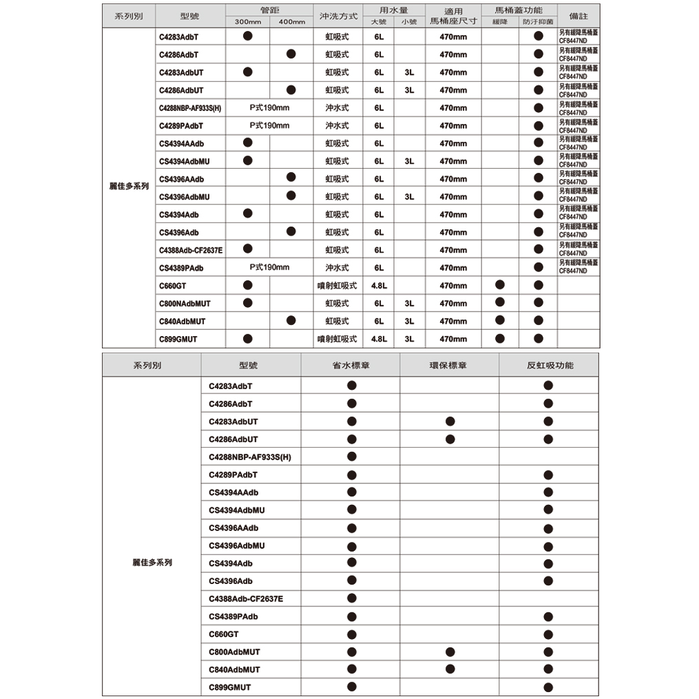 C4396Adb:700×395×400mm S4386Adb:440×178×368mm 牆面至排水管中心:400mm 適用水壓範圍:0.5~5kgf/c㎡ 沖水量:6L *可選購緩降馬桶蓋CF8447ND NT$ 4,200 沖洗方式:虹吸式 具反虹吸功能 適用馬桶蓋尺寸:470mm 馬桶蓋功能:防污抑菌