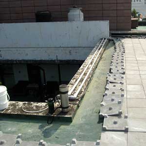 五腳隔熱磚其構成要素是以混凝土經高壓成型,成一水泥板厚2cm,五個腳厚3cm之五腳磚,利用空氣層產生對流作用,而達到隔熱效果。