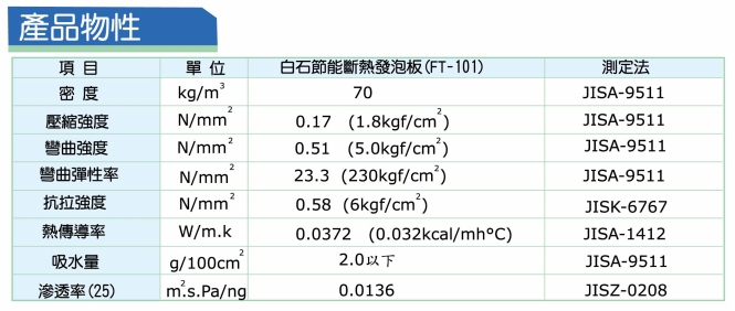 日本進口之白石節能斷熱發泡板其細胞封閉的特性,有極佳的阻熱耐久性,也不含對人體及環境的有害物質。與其他物材(如鐵/ PC,GRC等)結合複合材,可當作建物內/外隔板,三明治式結構之主材、冰箱/冷凍櫃之熱阻絕材及LPG,LNG與原油槽之熱阻絕材。