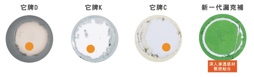 經過專業儀器附著力拉拔實驗,它牌防水底漆系統完全與底材光滑剝離。但新一代漏克補完全滲透與底材密合,經拉拔後底材也隨之破壞,證明漆膜能有效完全附著在底材上。