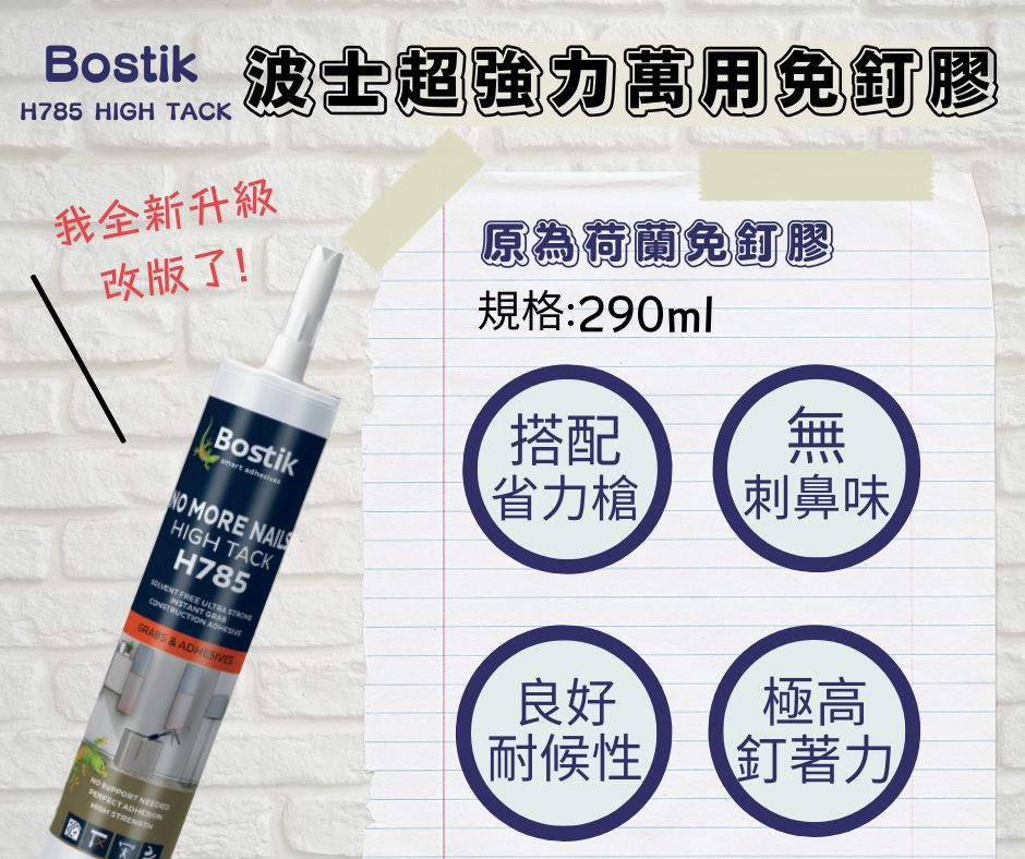 ✨Bostik H785為一款有超強初始接著力的高品質專業萬用型免釘膠