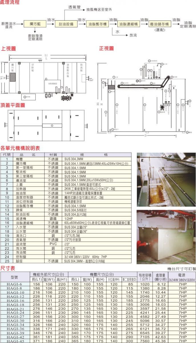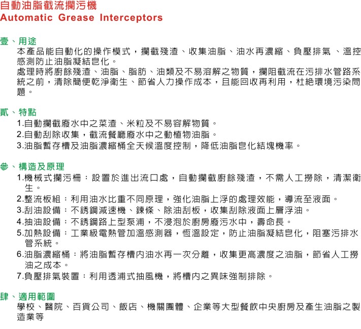 用途 攔阻、分離、收集污廢水中之油脂、殘渣和不易分解處理之物質