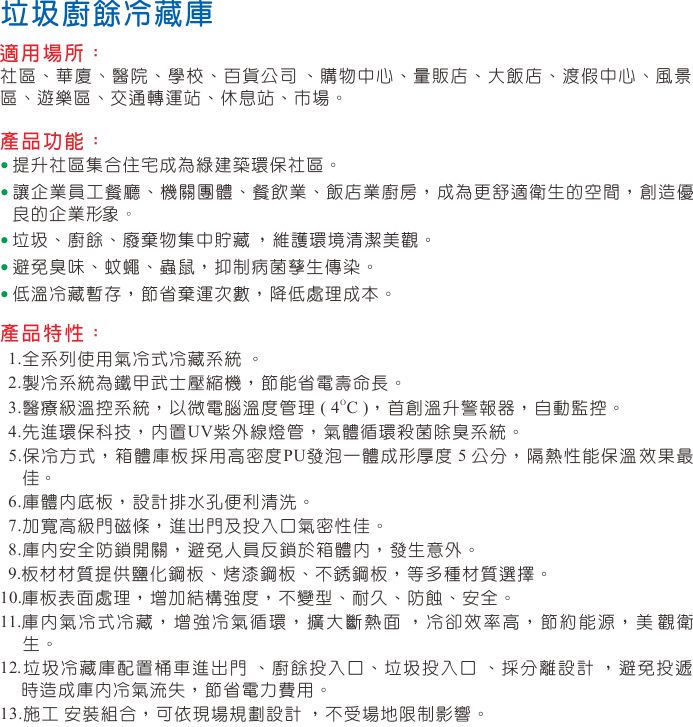 用途 集中低溫暫存垃圾、廚餘、廢棄物,抑制病菌,維護環境