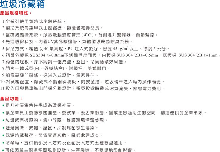 用途 集中低溫暫存垃圾、廢棄物,抑制病菌,維護環境