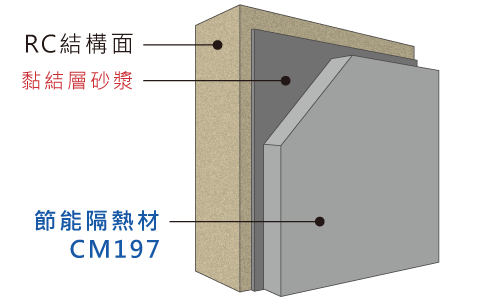 4.黏結層砂漿(黏著劑)建議以齒縫≧5mm齒鏝刀塗刮,提高與節能隔熱材(CM197)界面接著能力。