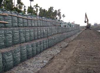 土石籠是以高鍍鋅機編石籠內部置放透水織物袋(織布或不織布),織物袋內填充就地取材之泥土、砂土、礫石或天然級配,組立形成重力式擋土護坡結構體。含水量太高之泥土、砂土,可以添加攪拌水泥固化,依據各種工程需求及填料種類,選擇適當的織物袋,織物袋須具有足夠的抗拉強度,抗穿刺力、抗撕裂力、透水係數及厚度等特性。