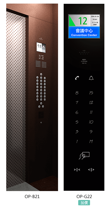 OP-B21為車廂側板式操作盤附LCD樓層顯示器;OP-G22 COP為加價型分離式觸控面板車廂操作盤附LCD樓層顯示器(與北京僑福芳草地同款)。