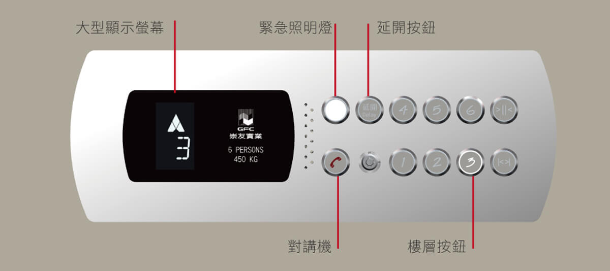 匠心獨具的車廂操作盤,除了有明亮的樓層指示及選擇按鈕外;尚有內建雙向通話對講機及緊急照明,橫向、腰間高度的設計更能體貼家中的長者或小孩。