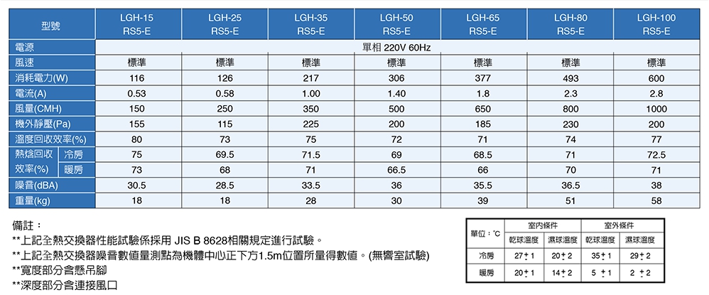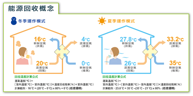 下圖為能源回收說明:若室外空氣為33度,則經過全熱交換器,將溫度調節為27.6度,若冷氣機的溫度設定在26度,則冷氣機的運作在全熱交換器的輔助下,只需降1.6度,因此可以達到節能省電效果。