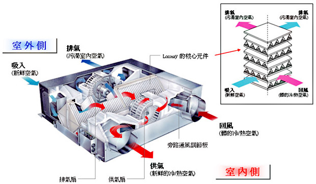 Lossnay熱交換核心,是為環保節能核心。使用特殊紙材再經處理後,採用平板與波浪方式交錯疊置,以讓有限容積空間發揮最大熱交換面積,將熱能回收效率大幅提升。交錯疊置結構讓排出室內渾濁空氣及引入室外新鮮空氣分 開流動不混合,並藉由紙為媒介將兩股氣流進行熱能量交換。