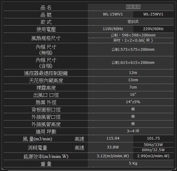 5.110V電壓及220V電壓,高轉速馬達輸入功率均小於52W,比一般風扇省30~40%電力。