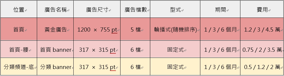 3.分類banner(三種分類的廣告欄位互相通用,皆會出現相同的廣告)